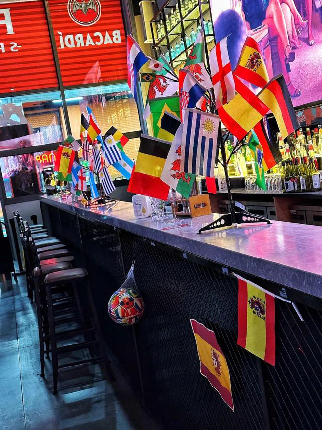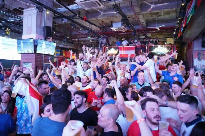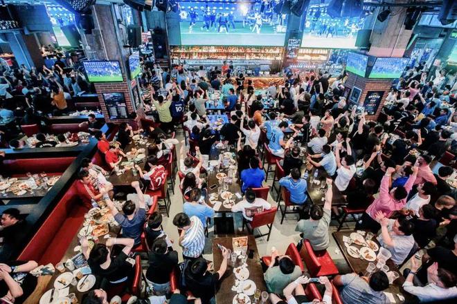 美式运动风格的装饰、海报、球衣、国足比赛,现场气氛十足。 还有很多国际友人齐聚一堂,与他们一起为自己喜欢的球队加油。 这个地方简直就像卡塔尔一样!