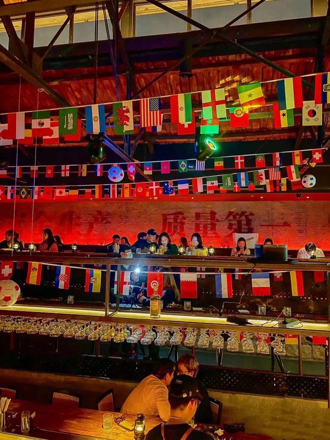 市中心淮海路旁的进贤酒吧街也藏着一处隐藏的世界杯宝藏观赏地。 酒吧是由一家老活塞工厂改造而成,充满了工业风格。 世界杯期间,悬挂队旗,更是……仪式感十足!